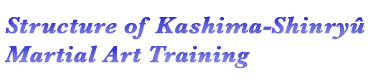 Kata TrainingKashima-Shinryû training consists of traditional methods of paired pattern practice (kata keiko). These patterns are performed in a highly realistic manner that allows students to internalize skills that can be employed freely without rigid adherence to any predetermined formal elements (such as rhythms, sequences, stances, etc.). For this reason, Kashima-Shinryû training always regards patterns as flexible living matrixes and never as dry, formal, predetermined "forms." Old traditions (koryû) must be mastered as living, dynamic, and effective martial arts.