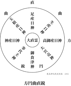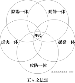 また、哲学的基本原理としての五ヶ之法定と並んで、物理的基本原理としての「方円曲直鋭」が鹿島神流の重要な要素であることも指摘しておかなければなりません。それは、全ての技を螺旋運動として操るための基本法則だとも言えます。究極的に「宇宙創元の理」へと収斂すべき鹿島神流の教義では、武術をも発顕・還元・推進を繰り返す無始無終の自然現象として捉えているのです。鹿島神流の構を例にとれば、それは技の起こりの形であると同時に技の最終形であり、動きを内在した静止状態だということになります。 |